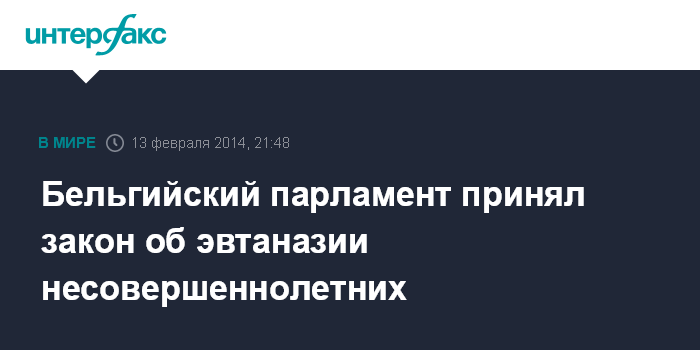 Брюссель. 13 февраля. INTERFAX.RU - Депутаты бельгийского парламента проголосовали в четверг за закон, предусматривающий возможность эвтаназии детей в случае неизлечимых заболеваний, причиняющих им невыносимые страдания.