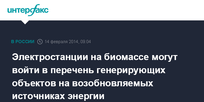 Москва. 14 февраля. INTERFAX.RU - Электростанции, работающие на биотопливе, могут быть включены в перечень генерирующих объектов на возобновляемых источниках энергии (ВИЭ), функционирующих на оптовом рынке электроэнергии и мощности России.