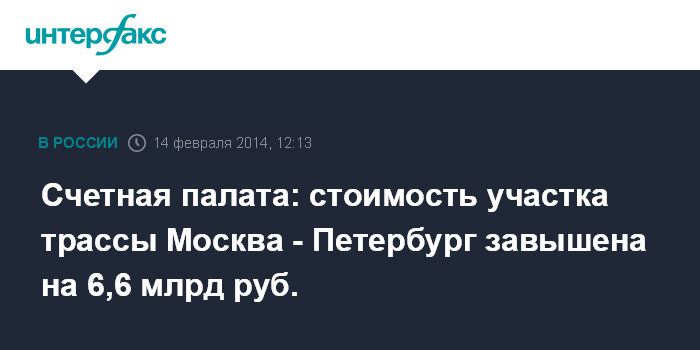 Счетная палата: стоимость участка трассы Москва - Петербург завышена на 6,6 млрд руб.