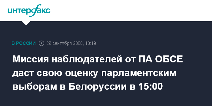 Москва. 29 сентября. INTERFAX.RU - Миссия наблюдателей от Парламентской ассамблеи ОБСЕ даст свою оценку белорусским парламентским выборам 29 сентября в 15.00, сообщила журналистам заместитель председателя ПА ОБСЕ, координатор краткосрочных наблюдателей ОБСЕ Анн-Мари Лизен.