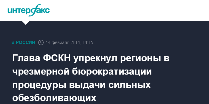 Москва. 14 февраля. INTERFAX.RU - Чрезмерность бюрократических проблем при выдаче пациентам сильнодействующих обезболивающих в России возникает по вине регионов, заявил директор Федеральной службы РФ по наркоконтролю Виктор Иванов.
