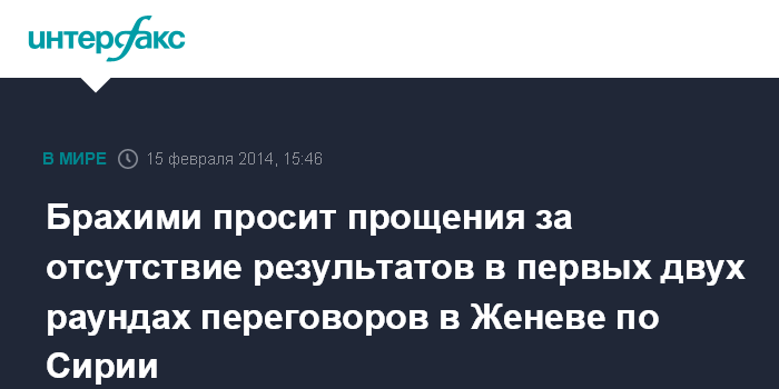 Москва. 15 февраля. INTERFAX.RU - Стороны сирийского конфликта за первые два раунда переговоров в Женеве не сумели добиться прогресса, заявил в субботу спецпредставитель ООН и ЛАГ Лахдар Брахими. "Я хочу попросить прощения у сирийского народа за то, что мы не смогли оправдать их ожидания", - сказал он на пресс-конференции.