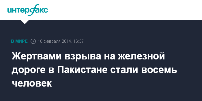 Москва. 16 февраля. INTERFAX.RU - По меньшей мере восемь человек погибли в результате взрыва бомбы на железнодорожных путях в момент прохождения пассажирского поезда в южной части Пакистана, заявили в воскресенье пакистанские власти. Еще более 30 человек получили ранения.