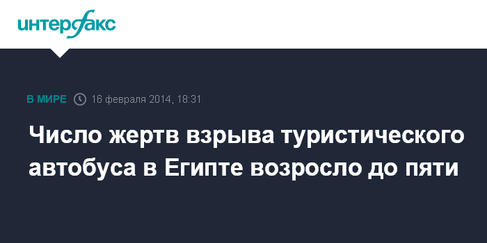 Москва. 16 февраля. INTERFAX.RU - По последним данным, пять человек погибли в результате взрыва автобуса с туристами в Египте недалеко от границы с Израилем, передает в воскресенье агентство AP со ссылкой на представителей египетских сил безопасности. В числе погибших - четыре туриста из Южной Кореи, а также водитель автобуса - гражданин Египта.