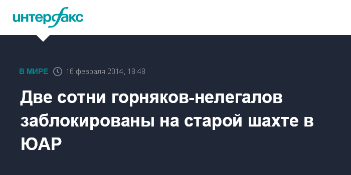 Москва. 16 февраля. INTERFAX.RU - Спасательные службы ЮАР предпринимают попытки спасти более 200 человек, находящихся под завалами в заброшенной золотодобывающей шахте недалеко от города Йоханнесбург, передает в воскресенье британский телеканал Sky News.