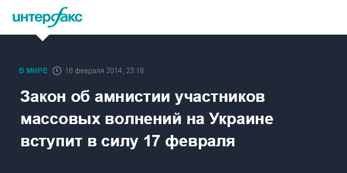 Киев. 16 февраля. INTERFAX.RU - Закон об амнистии для всех участников массовых волнений на Украине вступит в силу 17 февраля текущего года, сообщили агентству "Инерфакс-Украина" в воскресенье в пресс-службе Генеральной прокуратуры Украины.