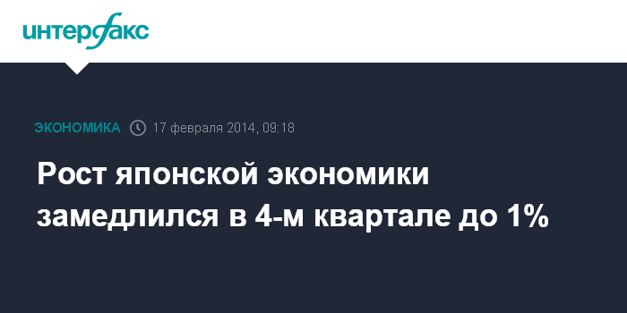 17 февраля. FINMARKET.RU - В четвертом квартале 2013 года ВВП Японии вырос на 1% в пересчете на годовые темпы по сравнению с повышением на 1,1% кварталом ранее, свидетельствуют обнародованные предварительные данные кабинета министров.