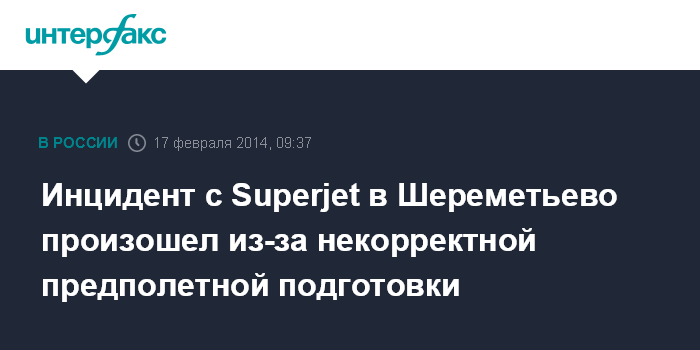 Москва. 17 февраля. INTERFAX.RU - Причина авиационного происшествия с самолетом SSJ100 в ночь на 14 февраля в аэропорту Шереметьево в некорректных предполетных процедурах, сообщает пресс-служба компании "Гражданские самолеты Сухого" (ГСС).