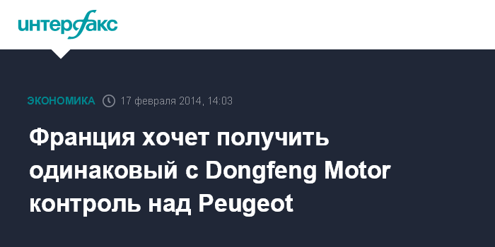 Москва. 17 февраля. INTERFAX.RU - Правительство Франции предпринимает шаги для того, чтобы не допустить получения Dongfeng Motor Co. контроля над автопроизводителем PSA Peugeot Citroen после того, как китайская компания стала одним из основных акционеров французской, пишет The Wall Street Journal со ссылкой на заявления источников.