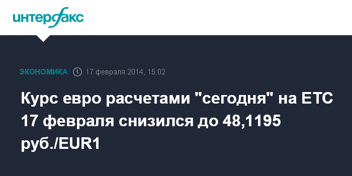 Курс евро расчетами "сегодня" на ЕТС 17 февраля снизился до 48,1195 руб./EUR1