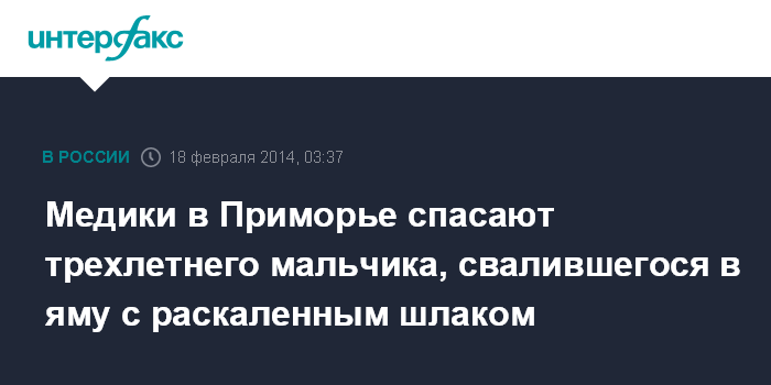 Москва. 18 февраля. INTERFAX.RU - В Спасском районе Приморья серьезно пострадал трехлетний мальчик, который упал в яму с раскаленным шлаком, вырытую в 20 метрах от игровой площадки, сообщает во вторник УМВД по Приморью.
