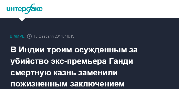 Дели. 18 февраля. INTERFAX.RU - Верховный суд Индии во вторник принял решение заменить смертную казнь пожизненным заключением в отношении трех человек, осужденных за убийство бывшего премьер-министра страны Раджива Ганди, передает индийский телеканал NDTV.