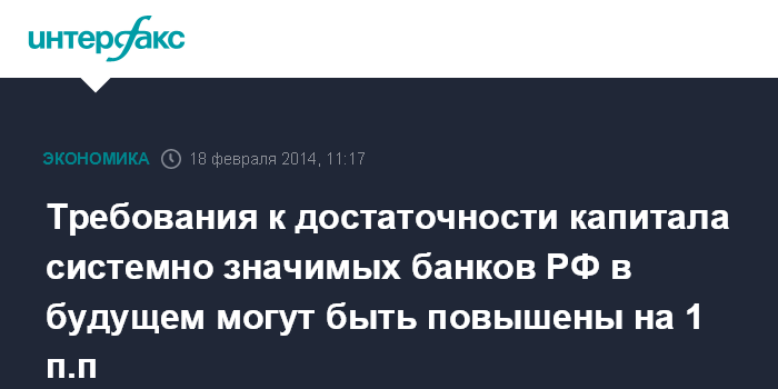 Москва. 18 февраля. INTERFAX.RU - Требования к достаточности общего капитала российских системно значимых банков в будущем могут быть выше на 1 процентный пункт (п.п.), заявил первый зампред ЦБ РФ Алексей Симановский на пресс-конференции в центральном офисе "Интерфакса" в Москве во вторник.