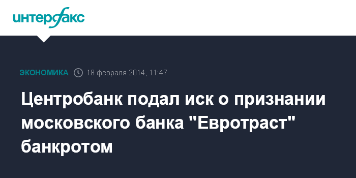 Центробанк подал иск о признании московского банка "Евротраст" банкротом