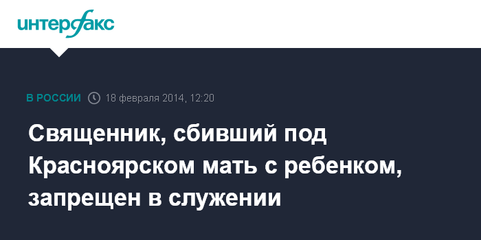 Москва. 18 февраля. INTERFAX.RU - Клирик Красноярской епархии, совершивший на днях наезд на переходившую дорогу женщину с ребенком в Ачинске, запрещен в священнослужении, сообщает во вторник пресс-служба синодального Информационного отдела.