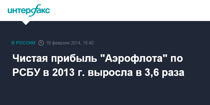 Москва. 18 февраля. INTERFAX.RU - Чистая прибыль ОАО "Аэрофлот - российские авиалинии" по РСБУ в 2013 году выросла в 3,6 раза по сравнению с 2012 годом, до 11,097 млрд руб., говорится в отчетности компании.