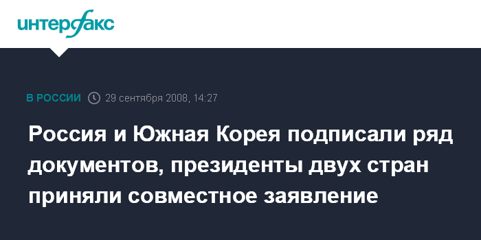 Москва. 29 сентября. INTERFAX.RU - Президенты России и Южной Кореи Дмитрий Медведев и Ли Мен Бак приняли в понедельник совместное заявление.