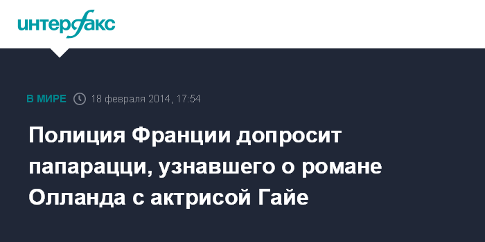 Париж. 18 февраля. INTERFAX.RU - Французская полиция вызвала на допрос фотографа Себастьена Валиелу, сделавшего снимки, которые подтвердили слухи о романтической связи между президентом страны Франсуа Олландом и актрисой Жюли Гайе.