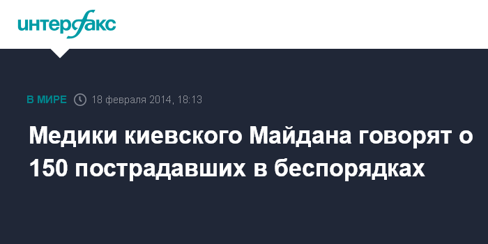 Киев. 18 февраля. INTERFAX.RU - В медицинской службе Майдана сообщили о 150 пострадавших в беспорядках во вторник в центре Киева. "Из 150 пострадавших у 130 тяжелые травмы, 25 - средней тяжести, у остальных - легкие травмы", - сообщил представитель медслужбы Майдана журналистам.