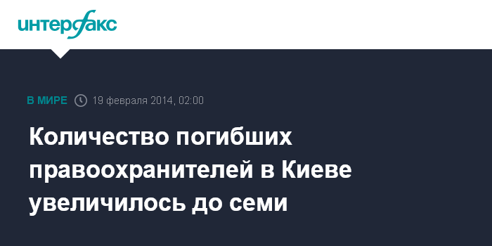 Москва. 19 февраля. INTERFAX.RU - До семи возросло количество правоохранителей, погибших в ходе массовых беспорядков во вторник в центре Киева.