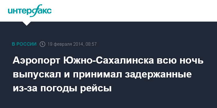 Южно-Сахалинск. 19 февраля. INTERFAX.RU - Аэропорт Южно-Сахалинска всю минувшую ночь выпускал и принимал воздушные суда, задержанные в понедельник и во вторник из-за метели и низкой видимости на юге Сахалина, сообщили "Интерфаксу" в пресс-службе аэропорта.