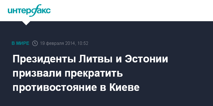 Таллин. 19 февраля. INTERFAX.RU - Президенты Литвы и Эстонии Даля Грибаускайте и Тоомас Хендрик Ильвес призвали прекратить противостояние сторон в Киеве и найти мирное решение кризиса.