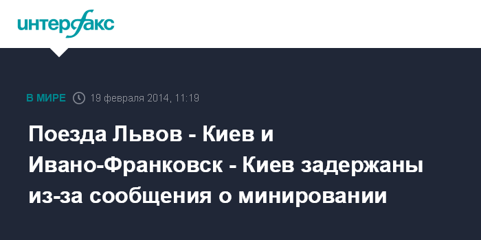 Киев. 19 февраля. INTERFAX.RU - Поезд № 142 Львов - Киев и поезд № 44 Ивано-Франковск - Киев были задержаны на пути следования из-за сообщения о нахождении в них взрывного устройства, сообщили агентству "Интерфакс" в государственной администрации железнодорожного транспорта Украины ("Укрзализныця").