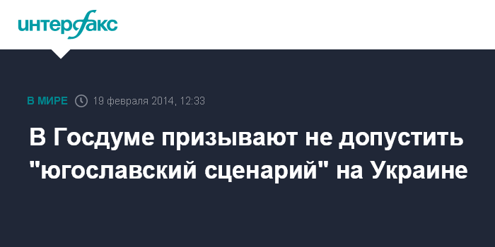 Москва. 19 февраля. INTERFAX.RU - В Госдуме призывают не допустить развитие "югославского сценария" на Украине и заявляют, что события в этой стране происходят при подстрекательстве Запада, который продолжает решать свои геополитические задачи.