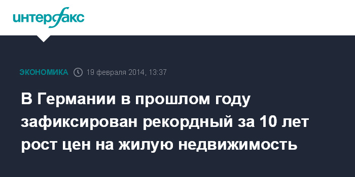 Москва. 19 февраля. INTERFAX.RU - В 2013 году повышение цен на жилую недвижимость в Германии оказалось сильнейшим по крайней мере за последнее десятилетие благодаря тому, что низкие процентные ставки сделали более привлекательными ипотечные кредиты, а также переключили внимание инвесторов с рынка облигаций.