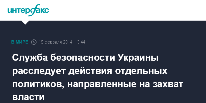 Киев. 19 февраля. INTERFAX.RU - Служба безопасности Украины 19 февраля начала досудебное расследование по факту совершения отдельными политиками незаконных действий, направленных на захват государственной власти.
