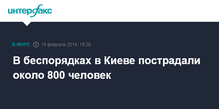 Москва. 19 февраля. INTERFAX.RU - Количество пострадавших в ходе беспорядков в Киеве составляет около 800 человек, из них 392 - сотрудники правоохранительных органов, сообщил замначальника Главного следственного управления МВД Украины Олег Татаров на встрече с иностранными послами в среду в Киеве.