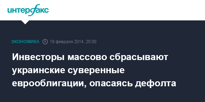 Москва. 19 февраля. INTERFAX.RU - Зарубежные инвесторы в среду массово ринулись сбрасывать украинские суверенные еврооблигации, опасаясь дефолта страны на фоне обострения в стране протестных настроений.