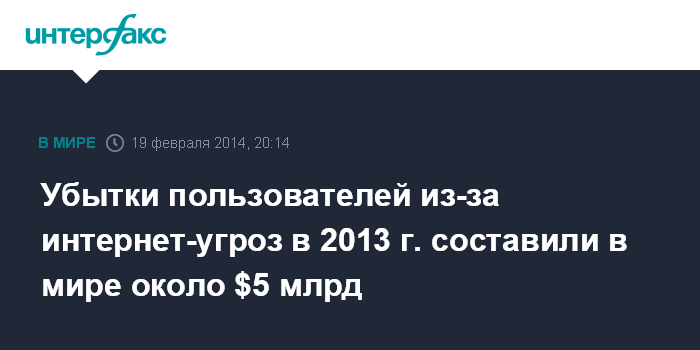 Москва. 19 февраля. INTERFAX.RU - Убытки пользователей в мире из-за небезопасного поведения в интернете составили в 2013 году около $5 млрд, следует из материалов отчета "Индекс компьютерной безопасности Microsoft" (MCSI).