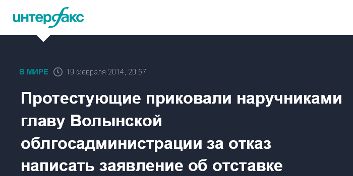 Москва. 19 февраля. INTERFAX.RU - Участники протеста в Луцке приковали главу Волынской областной государственной администрации Александра Башкаленко наручниками на сцене из-за его отказа написать заявление об уходе в отставку, пишет информагентство "Волынские новости".