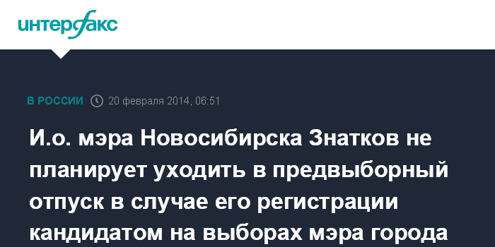 Новосибирск. 20 февраля. INTERFAX.RU - И.о. мэра Новосибирска Владимир Знатков заявляет, что не уйдет в предвыборный отпуск, если муниципальная избирательная комиссия зарегистрирует его в качестве кандидата от "Единой России" на досрочных выборах главы города.
