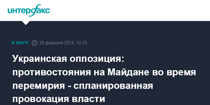 Москва. 20 февраля. INTERFAX.RU - Возобновление столкновений на майдане Независимости в Киеве во время объявленного перемирия - это спланированная провокация властей против мирных протестующих, говорится в заявлении лидера фракции УДАР Виталия Кличко, ВО "Батькивщина" Арсения Яценюка и ВО "Свобода" Олега Тягнибока.