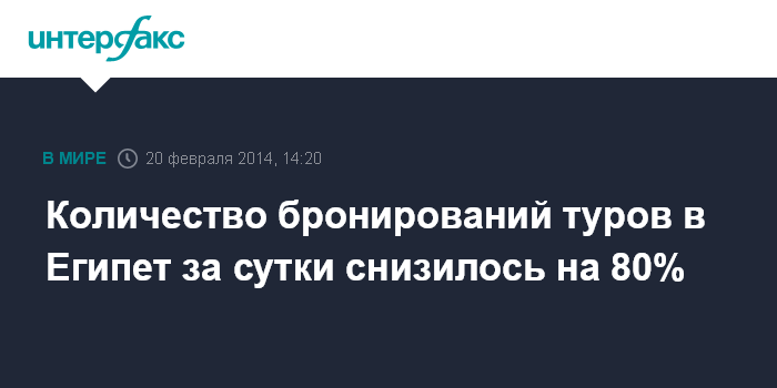 Москва. 20 февраля. INTERFAX.RU - Как минимум на 80% снизилось за прошедшие сутки количество бронирований турпоездок в Египет в российских туркомпаниях, сообщила исполнительный директор Ассоциации туроператоров России (АТОР) Майя Ломидзе журналистам в четверг.
