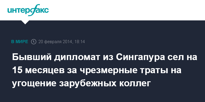 Москва. 20 февраля. INTERFAX.RU - Высокопоставленный экс-сотрудник МИД Сингапура осужден на 15 месяцев заключения за растрату государственных денег на закупку вина и ананасовых тарталеток для угощения гостей дипломатических мероприятий, пишет в четверг американская газета The Wall Street Journal.