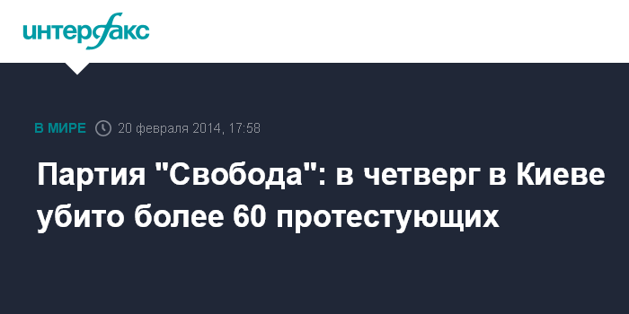 "По предварительным данным, охранники режима Януковича только за сегодня, 20 февраля 2014, по состоянию на 15.20 убили более 60 человек… Применяют обычные боевые и бронебойные патроны, стреляют на поражение в голову, шею, грудную клетку, живот. Основные места концентрации убитых и раненых - на улице Институтской, возле дворца Свободы (бывшего Октябрьского), гостиницы "Украина", на Михайловской улице возле отеля "Казацкий". Также тяжело ранена в шею медик-волонтерша", - цитирует С.Ханенко пресс-службе ВО "Свобода".