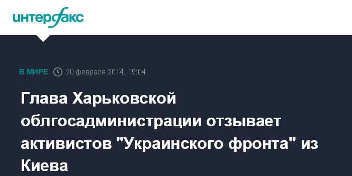Москва. 20 февраля. INTERFAX.RU - Глава Харьковской облгосадминистрации, глава ХОО Партии регионов Михаил Добкин отзывает активистов общественного движения "Украинский фронт" из Киева.