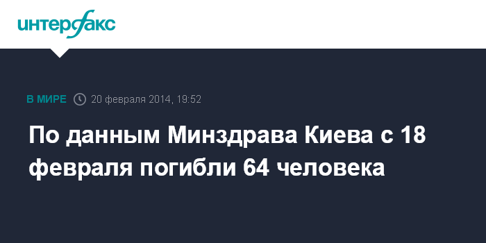 Москва. 20 февраля. INTERFAX.RU - С начала массовых беспорядков в Киеве 18 февраля 2014 на данный момент погибли 64 человека, сообщает департамент здравоохранения Киевской городской государственной администрации.