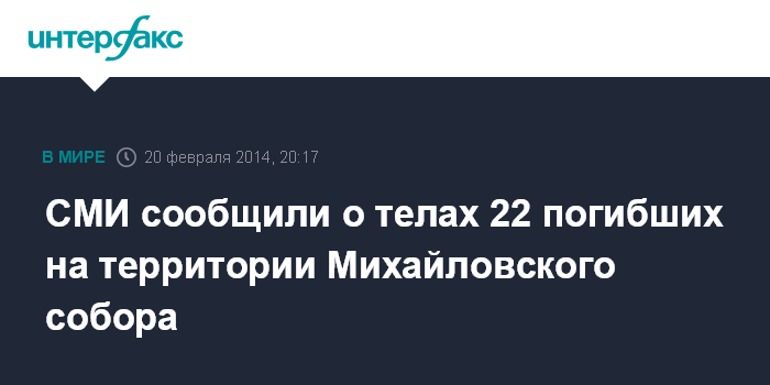 Москва. 20 февраля. INTERFAX.RU - Тела 22 погибших протестующих находятся на территории Михайловского собора, где находится временный медпункт Майдана.