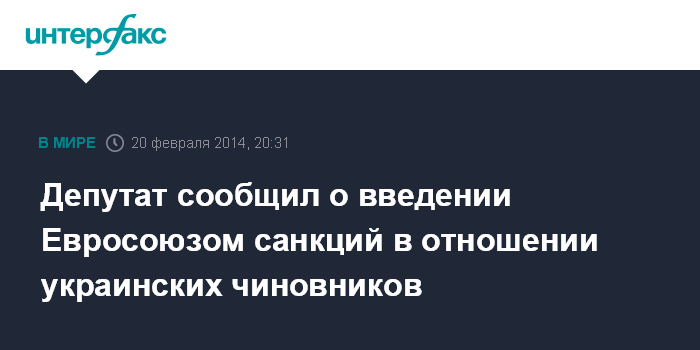 Москва. 20 февраля. INTERFAX.RU - Европейский союз принял решение ввести экономические, миграционные и финансовые санкции в отношении украинских чиновников, причастных к беспорядкам и гибели людей, сообщил внефракционный народный депутат Петр Порошенко, ссылаясь на разговор с председателем Европейского совета Хермана ван Ромпея.