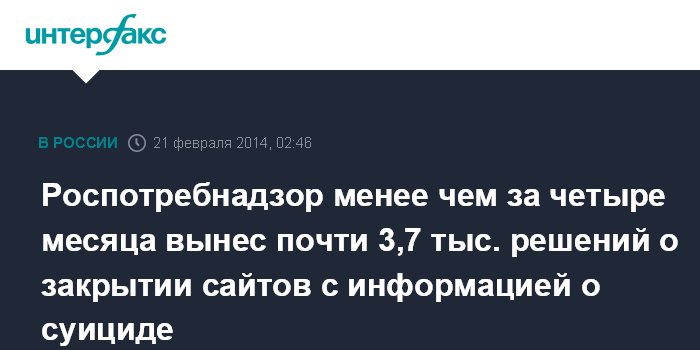 Москва. 21 февраля. INTERFAX.RU - Органами Роспотребнадзора с ноября прошлого года вынесено 3699 решений о закрытии страниц интернет-сайтов, содержащих информацию о способах самоубийства.