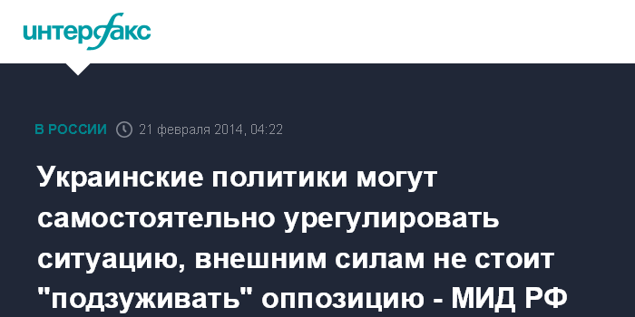 Москва. 21 февраля. ИНТЕРФАКС - МИД России призывает внешних игроков, не подталкивать оппозицию Украины к дальнейшей дестабилизации обстановки в стране.