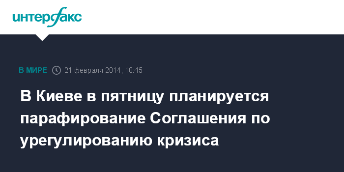 Киев. 21 февраля. INTERFAX.RU - В 12:00 пятницы в администрации президента Украины планируется парафирование Соглашения по урегулированию кризиса в Украине, сообщает пресс-служба главы государства.