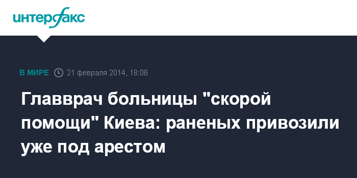 Киев. 21 февраля. ИНТЕРФАКС-УКРАИНА - Главврач больницы скорой медицинской помощи (БСПМ) Александр Ткаченко заверяет, что доставленных в больницу раненых правоохранители не вывозили и не арестовывали.