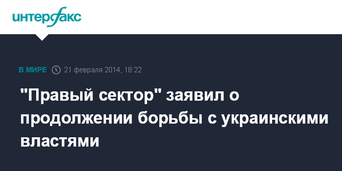 Москва. 21 февраля. INTERFAX.RU - В ультрарадикальном движении "Правый сектор" заявили, что не доверяют заявлениям президента Украины Виктора Януковича, и намерены продолжать борьбу с действующей властью.