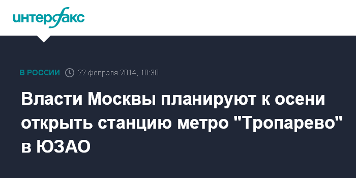 Власти Москвы планируют к осени открыть станцию метро "Тропарево" в ЮЗАО