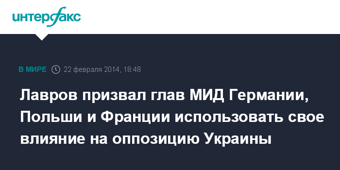 На Смоленской площади рассказали, что министр "настоятельно призвал Германию, Польшу и Францию как страны, которые активно продвигали и засвидетельствовали подписание соглашения от 21 февраля, использовать свое влияние на оппозицию, чтобы добиться его немедленного выполнения и обуздания бесчинствующих молодчиков". "Пора прекратить вводить в заблуждение мировую общественность и делать вид, будто сегодняшний Майдан представляет интересы украинского народа", - отметили в МИД РФ.